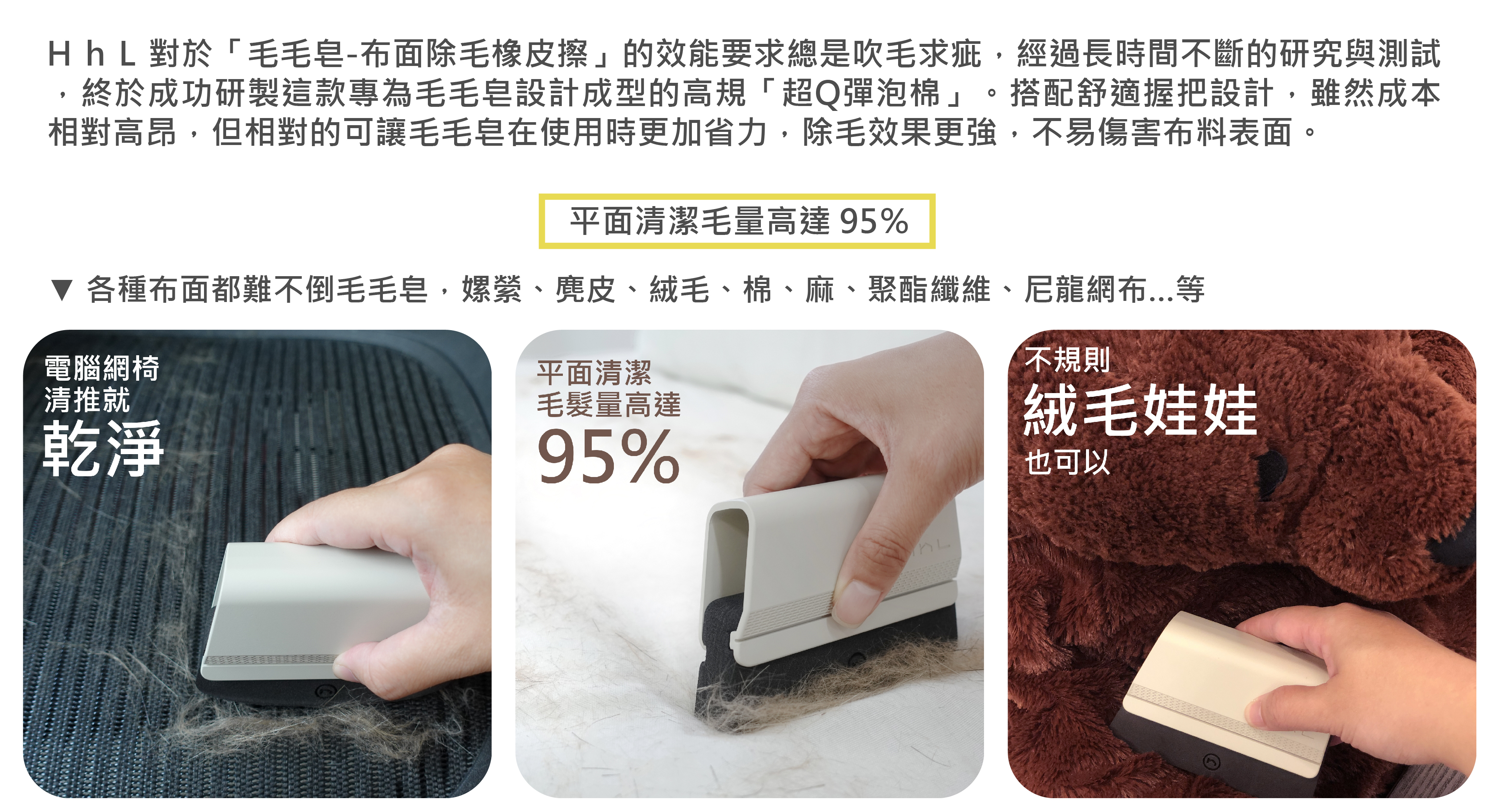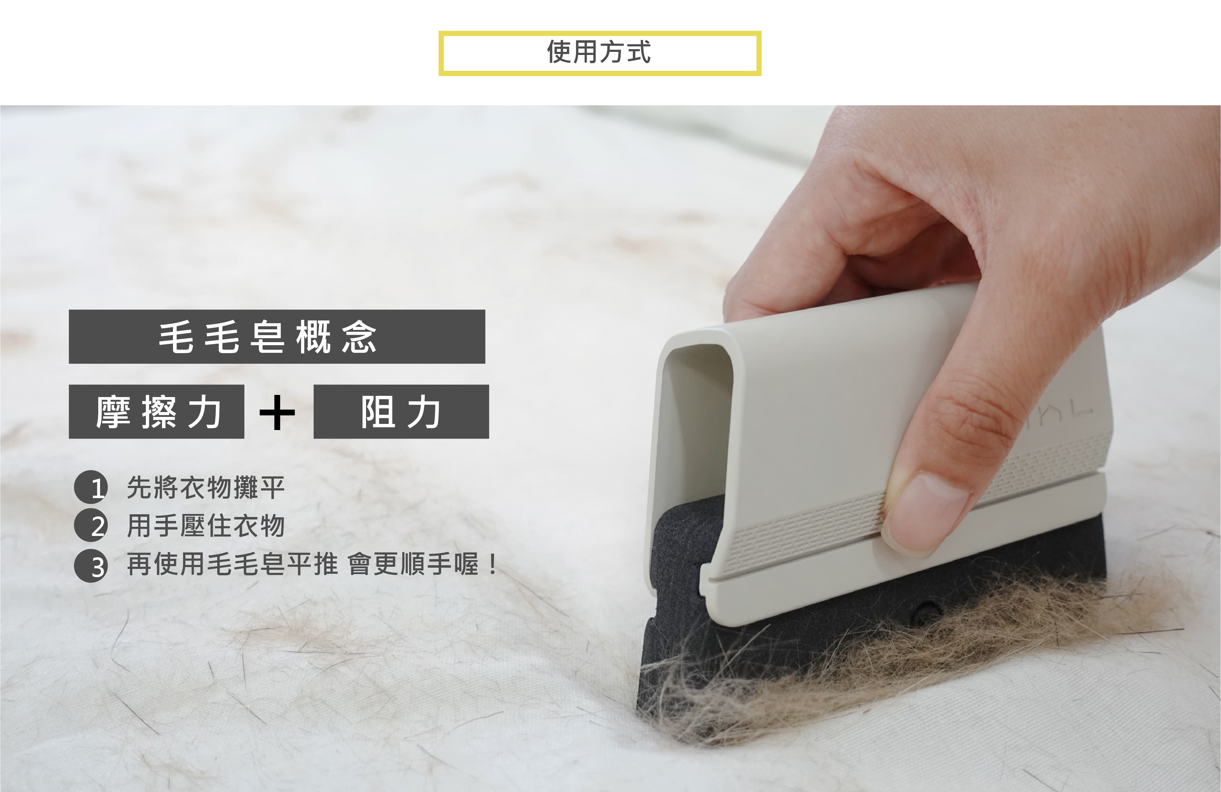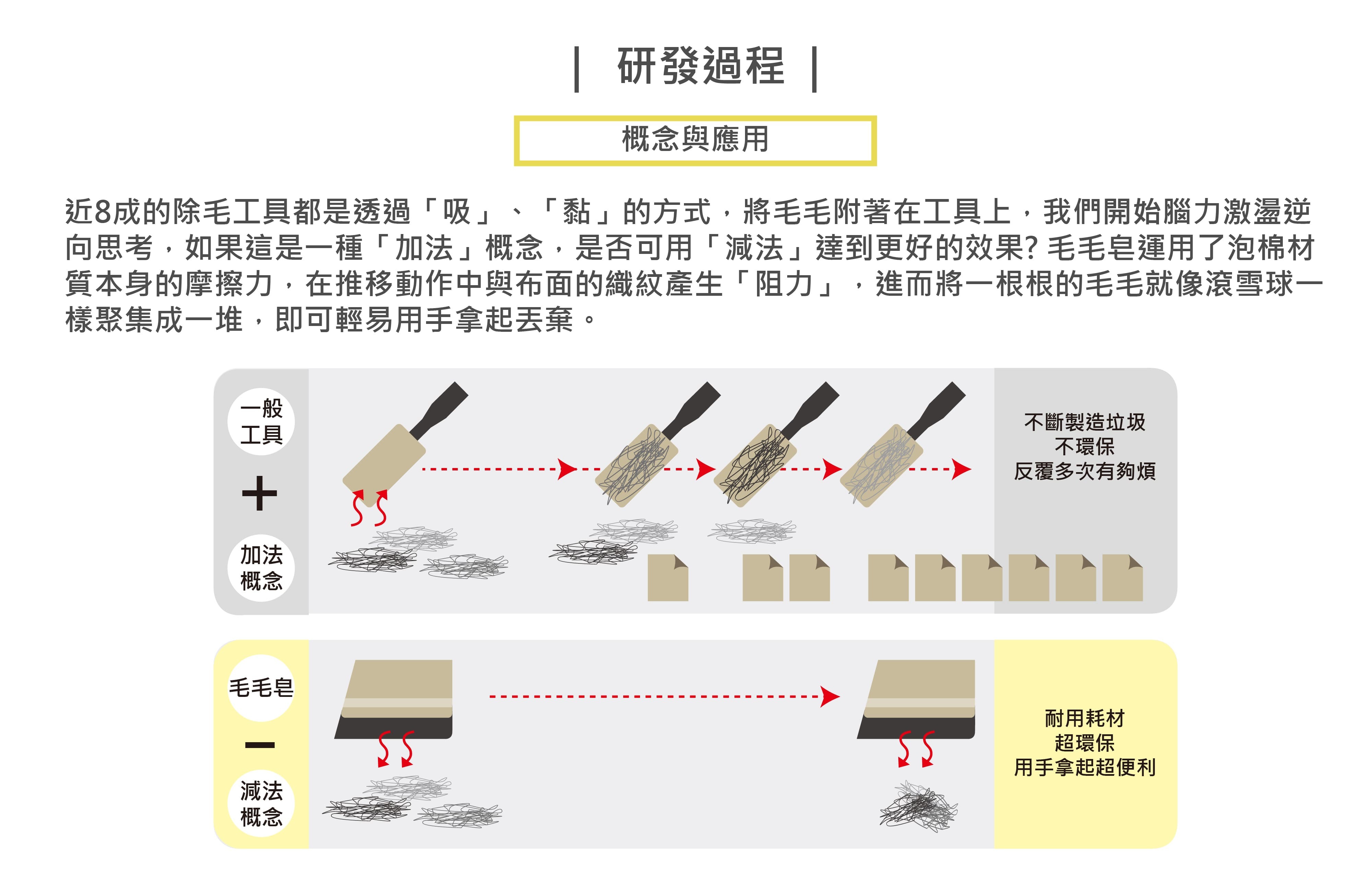 Therefore, we reverse thinking and come up with a “Subtraction design” product—“Mao-mao-zao”. Under the principle of no fur sticking on the cleaning tool, this technique makes bottom sponge generate resistance with surface to removes ground-in dirt from the fabric. Similar to the concept of eraser, we could gather the fur with hands easily. Therefore, using “Mao-mao-zao”will minimize the waste of consumables. It’s not only more user- friendly but also more environmental-friendly.