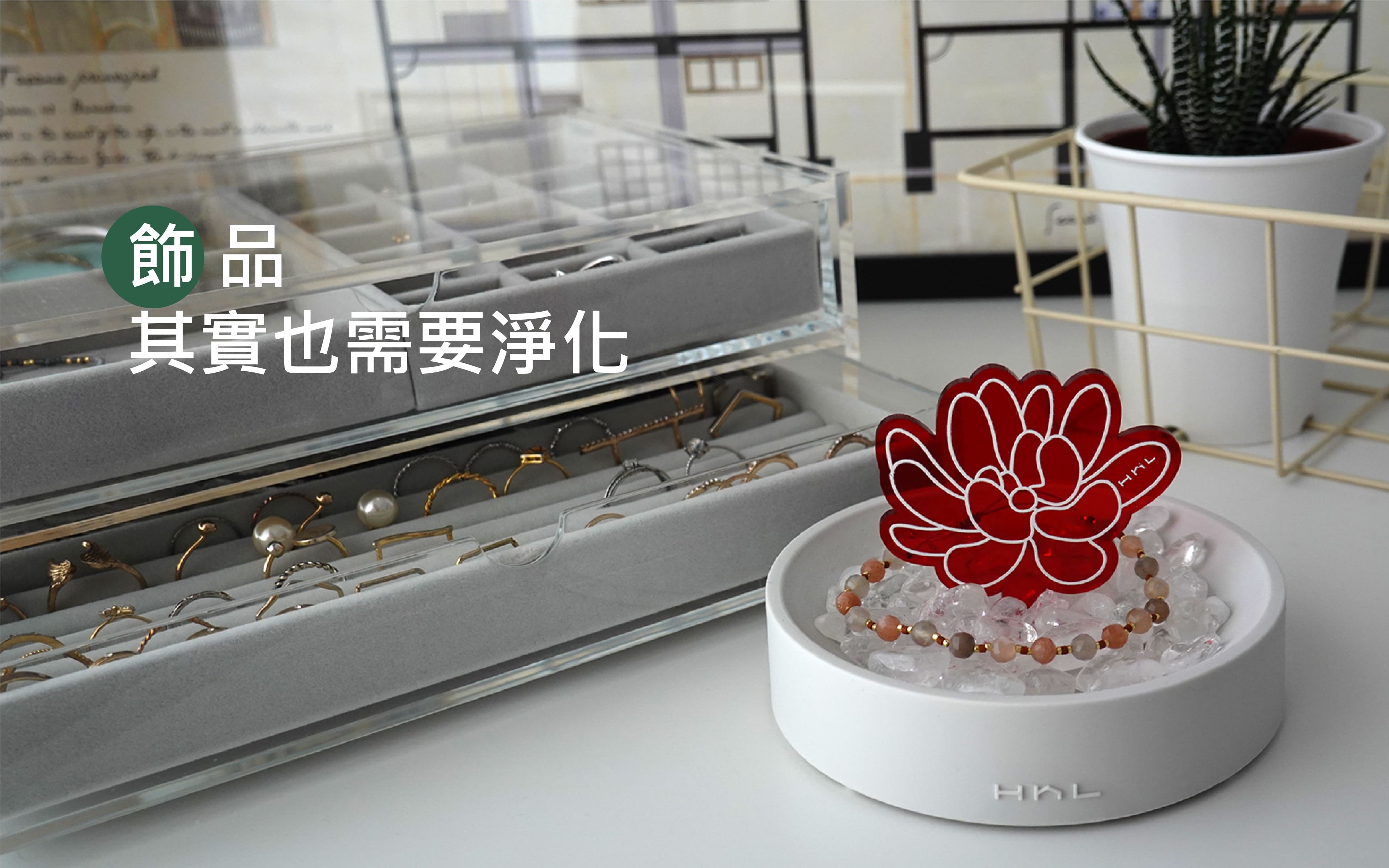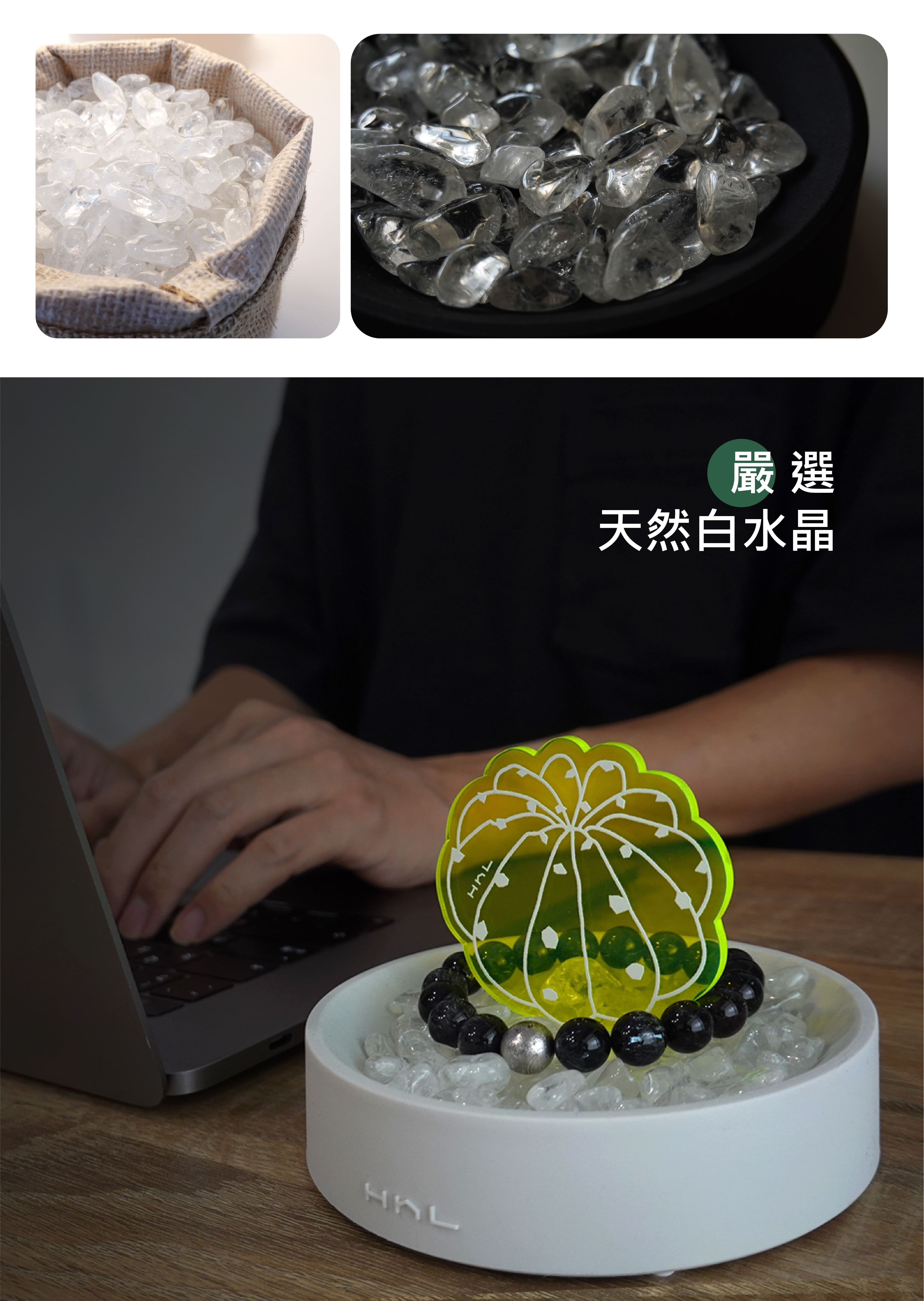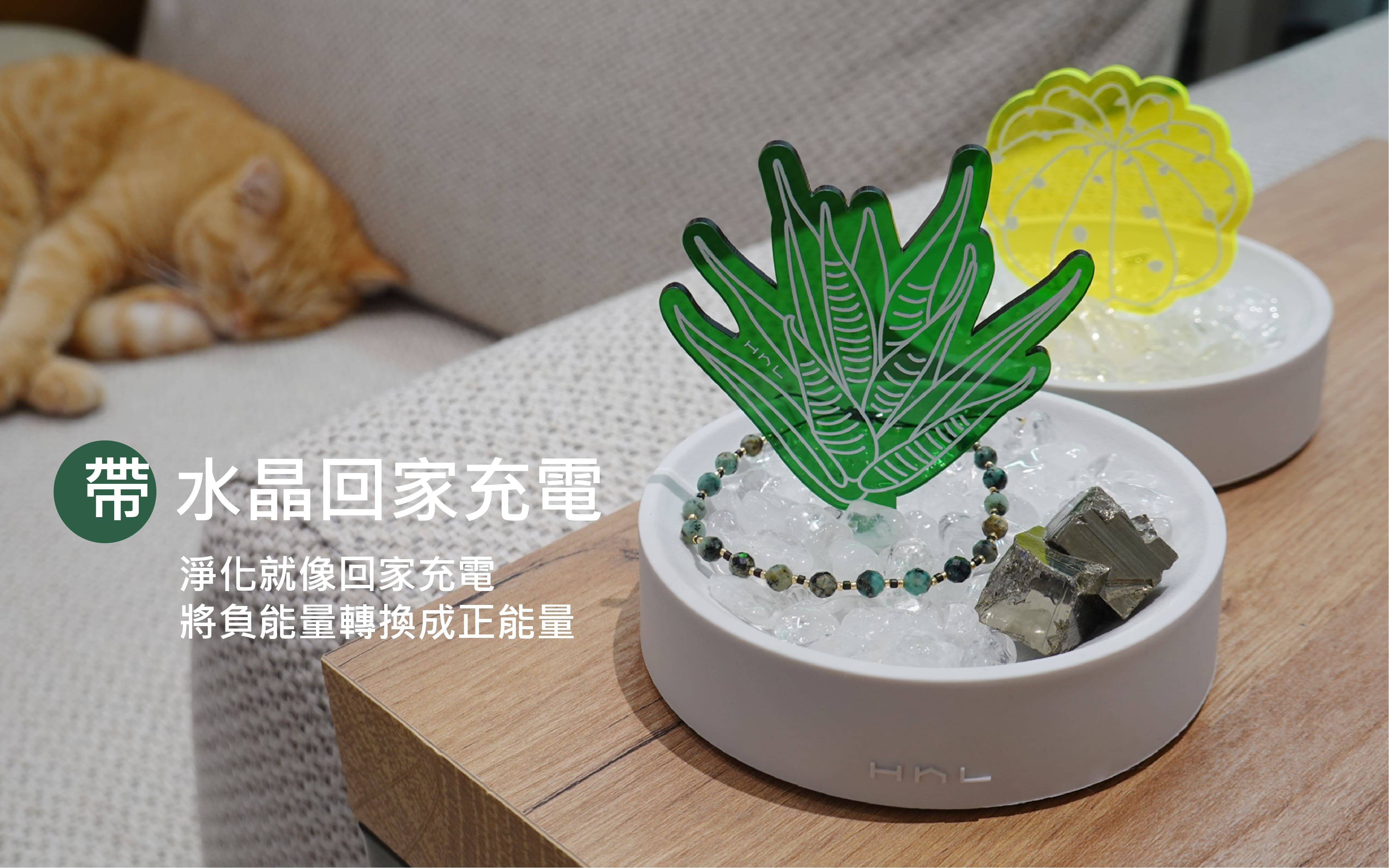 水晶 (天然石) 的能量數千年來一直被證實並廣泛的運用著,不論是佩戴的飾品或蒐藏的擺飾,磁場皆因萬物而相互影響,唯有透過淨化可使它回到原始設定。熱愛水晶的H h L致力將水晶產品化,用設計重新定義消磁盆。將盆作為宅,宅中有植物,喻意為「盆宅」。