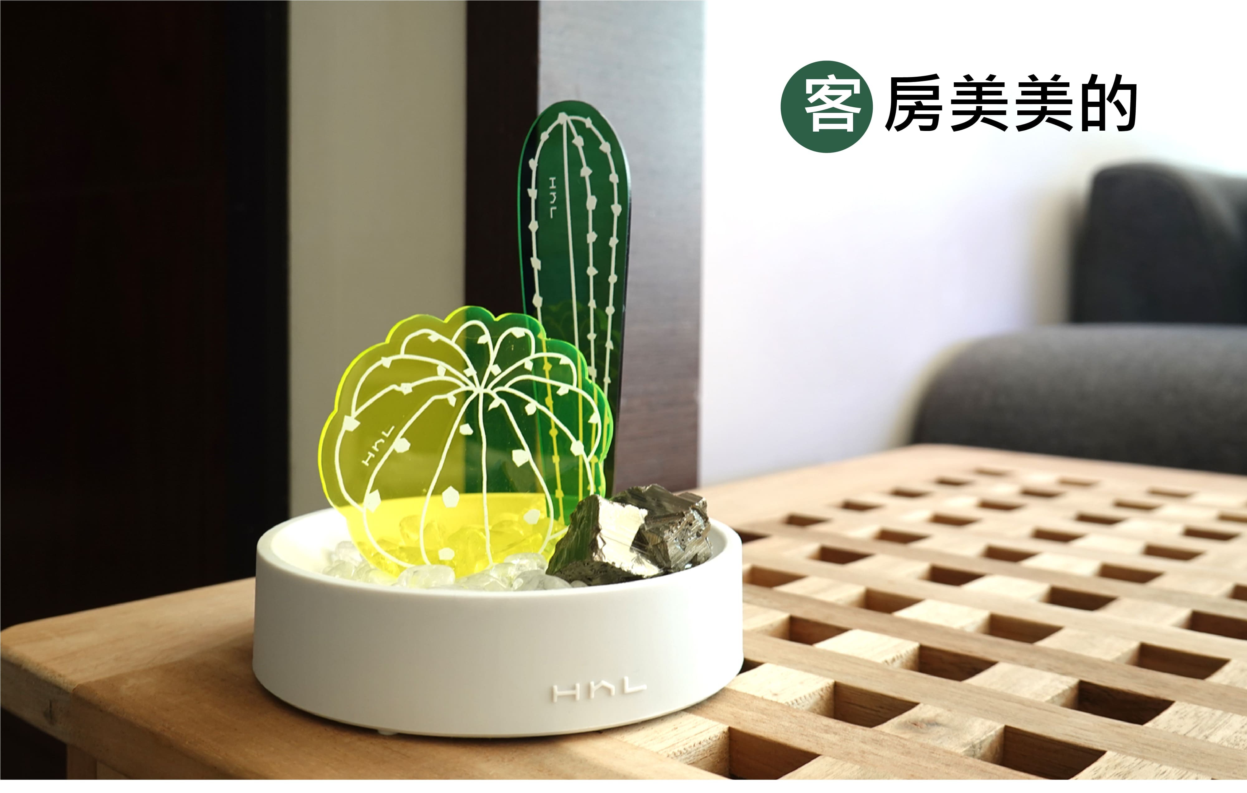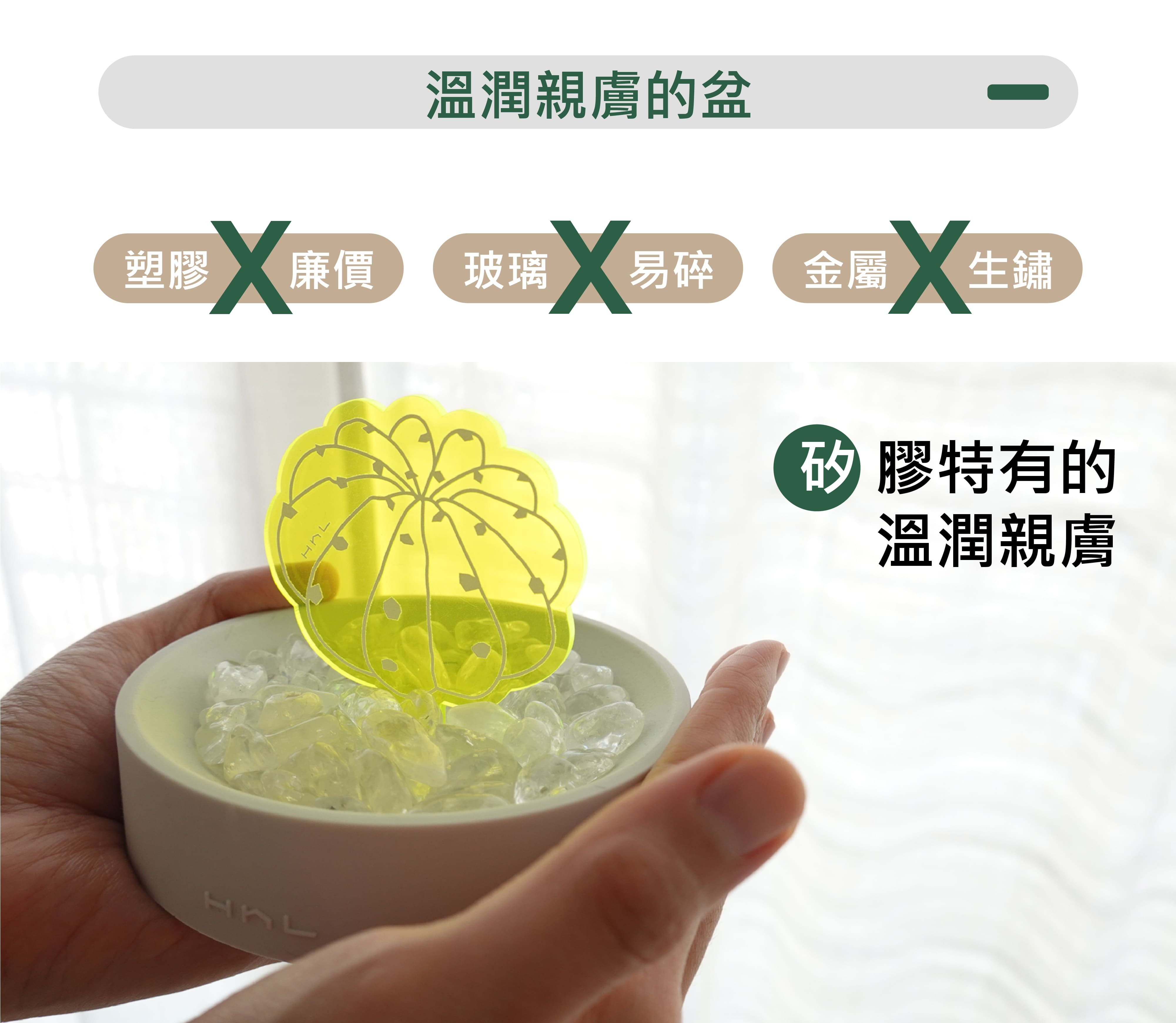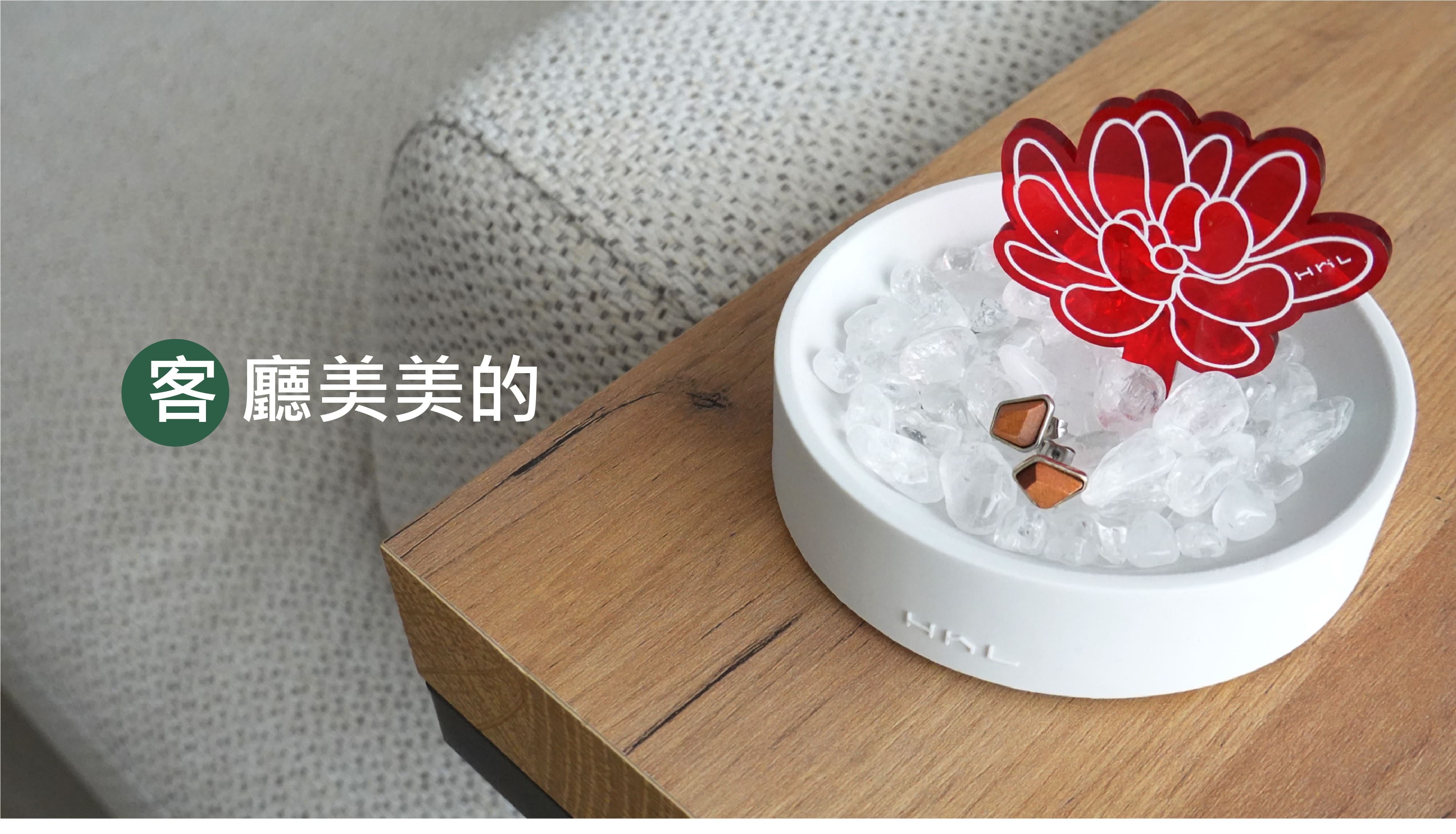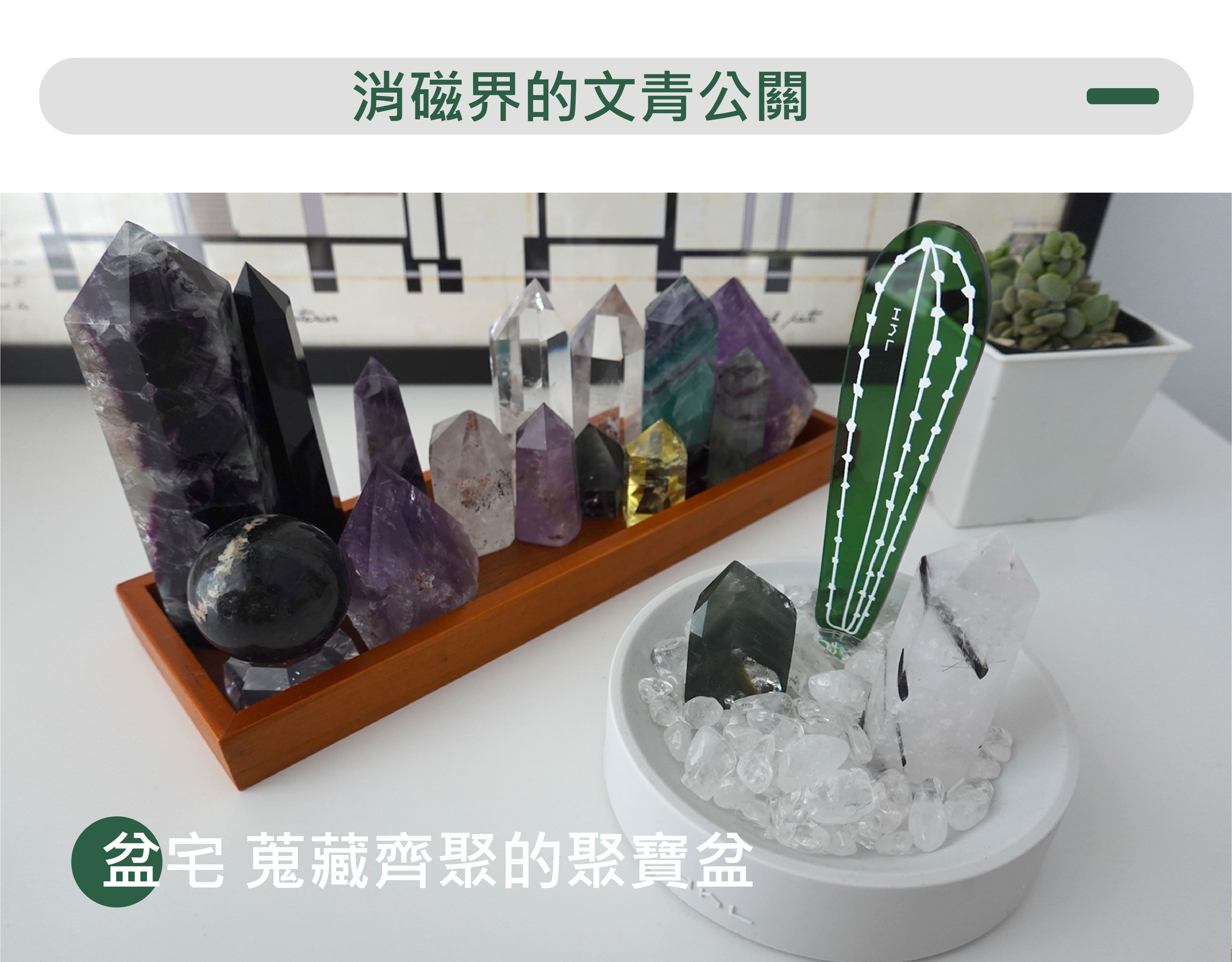 水晶 (天然石) 的能量數千年來一直被證實並廣泛的運用著,不論是佩戴的飾品或蒐藏的擺飾,磁場皆因萬物而相互影響,唯有透過淨化可使它回到原始設定。熱愛水晶的H h L致力將水晶產品化,用設計重新定義消磁盆。將盆作為宅,宅中有植物,喻意為「盆宅」。